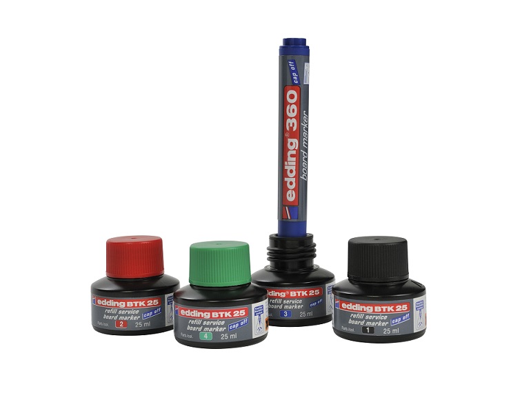 Plniaci atrament BTK 25, vhodný pre popisovače E–360, E-361 na biele tabule. Obsah fľaštičky 25 ml. Pri doĺňaní sa vloží predná časť popisovača špičkou do fľaštičky a po niekoľkých minútach bude popisovač pripravený k opätovnému použitiu.