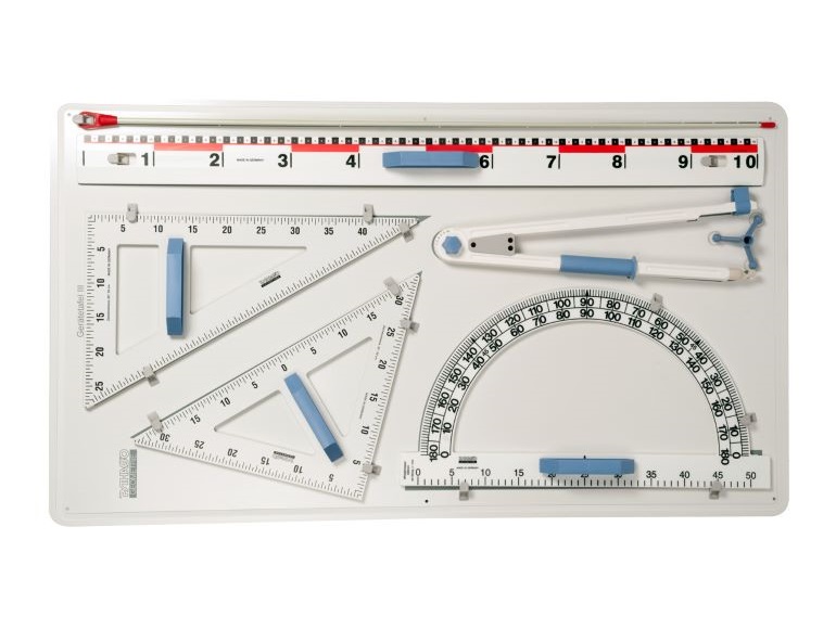 Sada tabuľového náradia WH obsahuje pravítko PY 100 cm, uhlomer PY, trojuholník PY 45°, trojuholník PY 60°, kružidlo s prísavkami, ukazovadlo PY 105 cm Pevná plastová doska 100×63 cm, s úchytmi na náradie, umožňuje montáž sady na stenu.